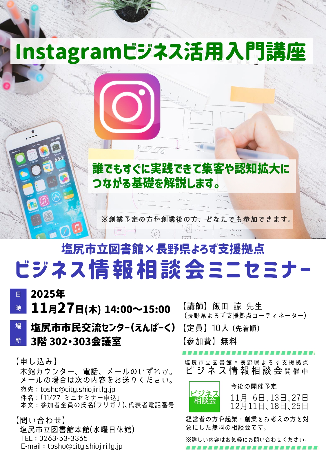 11月27日(木)14:00~15:00 塩尻市立図書館×長野県よろず支援拠点『Instagramビジネス活用入門講座』
