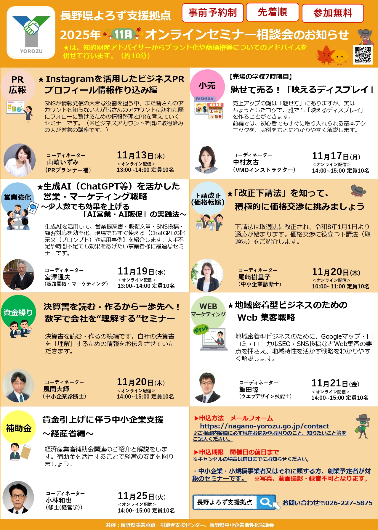 長野県よろず支援拠点の7名のコーディネーターによるオンラインセミナー相談会を開催します!